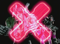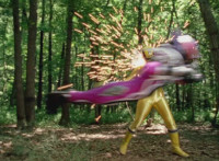 Yellow charges in, as does the armored Morgana, both meeting in the middle, Yellow ducks under Morgana's strike, but her second one sparkily lands, then she kicks her feet out from under her. Yellow falls, then gets kicked away, where she rolls up to a crouch. Morgana speaks, then Yellow whips out her weapons, connects them, then fires, spark bursting around her. Yellow lowers her guard, when Morgana flies out of the smoke, sparkily striking her down on the way by. By the time Yellow recovers, Morgana is up in a tree, showing off her blade. Yellow fires upon her, she drops down before the sparking, landing with a sparkily slash into the Ranger, a dodged kick, then she hits her weapon aside, and a few more sparkily slashes. Finally, Morgana charges up her blades and purple X slices at Yellow, bursting her. |