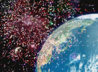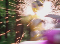 Lasers rain down on Shorty, spark bursting him. |