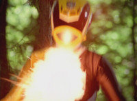 The Rangers ready their weapons and fire lasers at Shorty, bursting before him. Shorty levitates forth through the smoke, flying with a kick at Red. |