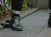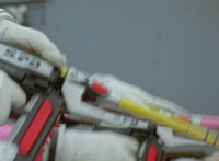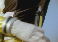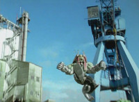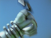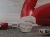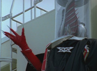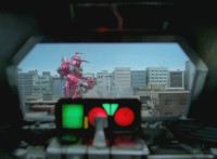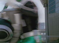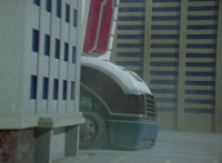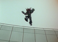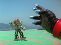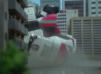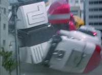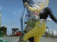 Shorty holds a detonator, talks a bit, then leaps from the small silver tower, over to the building tower, where he walks over to the edge and talks. Delta Squad Megazord's saber has been clasped by Robot of Destruction again, as it struggles. Shorty talks some more. Yellow speaks and reaches out, as we zoom out from her in her cockpit, to Shorty watching the battle. Suddenly, Shadow streaks in and jumpkicks into Shorty, causing him to lose hold of the detonator, sending it flying and falling to the ground below. Shadow lands on the roof, Yellow reacts, Shadow speaks into his Patrol Morpher, as Shorty talks nearby. |