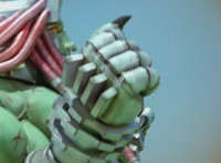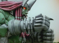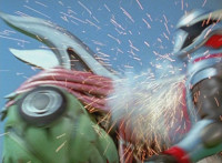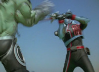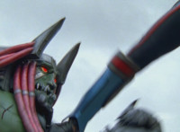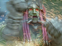 Shadow poses with his Shadow Saber, Shorty readies his fists and runs forth, Shadow and he meeting in the middle, where Shorty blocks each slash or jab. Shadow finally slices by Shorty, but no sparks result, much to his surprise. Shorty beats on his chest, as Shadow down-slashes at Shorty, but the blade hits his skin and bounces off harmlessly. Shadow reacts, Shorty yacks, and soon Shadow raises his blade overhead and slashes downward. |