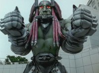 Zoom out as Shorty acts excited, raising fist into the air, as shot pans up to Robot of Destruction above him. |