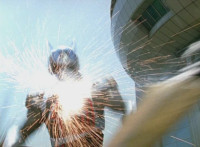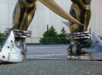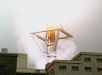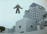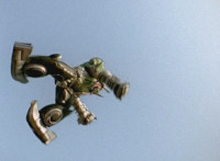 Beside a tower, the Robot of Destruction lowers on boot boosters and lands in the city. |