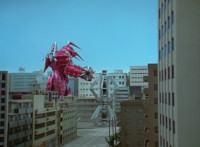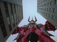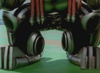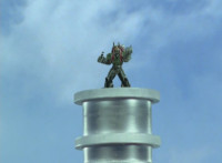 Red straightens up his cockpit, causing Delta Squad Megazord to get back up. Shorty leaps up into the air with a giant ball, tossing it into the silver tower, which he then lands on, talking and patting his fists. The Megazord spots this, and is about to attack, when Robot of Destruction blocks it, then walks over and sparkily punches it, then again. |