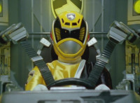Delta Squad Megazord falls over, shaking up the Rangers in their cockpits. Zoom in on Robot of Destruction posing triumphant. Yellow nod-talks in her sideways cockpit, . |