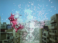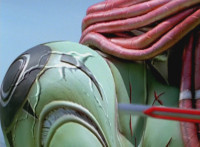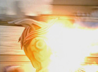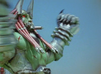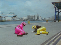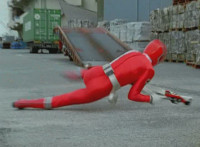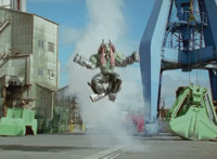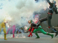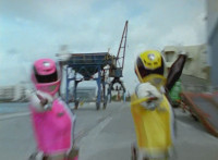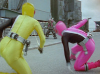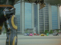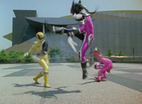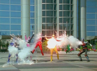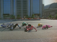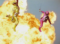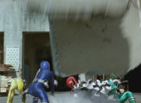 Both shots have lasers added; cuts follow-ups of Rangers regrouping, Green doing a headstand, then talking while Pink calls out to Shorty, and when he opens his mouth, Yellow tosses rings into his mouth, which burst inside. |