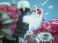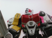 Shorty leaps up and sparkily lands both fists on Shadow, knocking him for a roll. Delta Squad Megazord gets sparkily struck in the hand, dropping its Saber. It then looks over as Robot of Destruction races at it, then dives down, grabs its legs, and flips it on its back, shaking up the cockpits. |