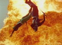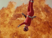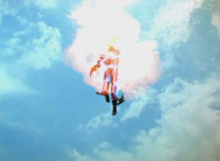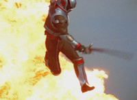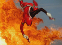 Red flips into the air in front of an explosion. |