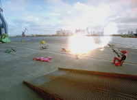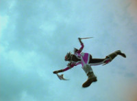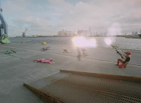 Blue falls into the water, Yellow & Pink jab at Shorty with their blades, he grabs them and spins the pair around before releasing and causing them to fall down. |