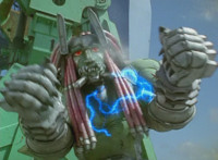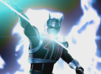 Devastation readies his thunderbolt blade, and slashes it forth, sending a shockwave that spark bursts all six Rangers, knocking them all down. Devastation lowers his blade triumphantly, as the Rangers slowly recover. |