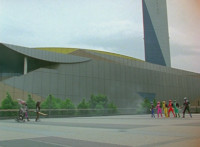 The Robot of Destruction approaches some buildings, Morgana flips a switch, and it fires shoulder beams forth, creating a silver tower, which it stands watch over. Nearby on a rooftop, Broodwing lurks, talking and gesturing. |