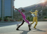 Devastation and Shadow race at one another, and sparkily clash blades a few times, then Shadow gets sparkily slashed until he falls and rolls. Devastation goes to downward slash him when he's crouched, but he blocks his blade. The Rangers react to this, Yellow then looking upward as a helmetless Morgana flips in and lands on one side of the team, while Shorty, on the other side, beats his chest and talks. The three guys react to him, while the girls focus on Morgana. |