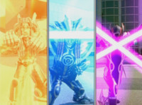 Yellow jabs forth, as Morgana spins and dodges, then sparkily slashes her, doing the same to Pink, then roundhousing Yellow. |