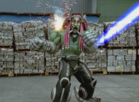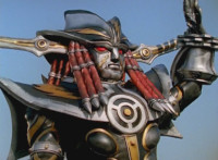 Devastation aims his rifle forth at the Rangers. |