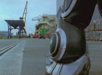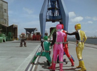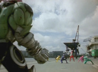 Shorty approaches the dock view of the city skyline, where he talks and gestures, until the five Rangers make the scene. He speaks to them, Red replies. |