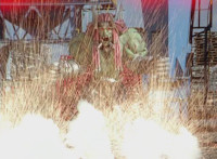 Shorty leaps down and sparkily bashes Red & Green, causing them to fall and roll, as Pink & Blue regroup with them. Shorty pounds his chest and gestures, then Red rushes forth and poses. Shorty charges at the four, sparkily bashing through each one, with much crackling of energy. |