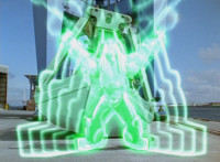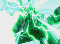 Shorty bends down and spreads his arms, spewing green electricity downward. |