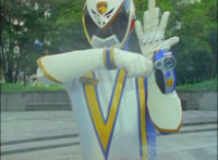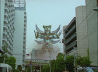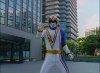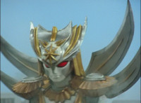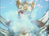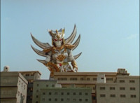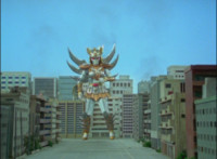 Angel Robot bursts, collapses, and explodes massively before Omegamax Megazord. Red acts relieved, as the Megazord poses triumphantly beside a building, where, in the mirrored glass, Mirloc appears. |