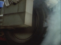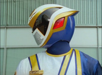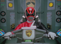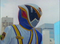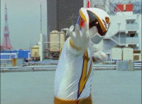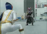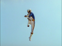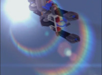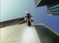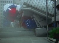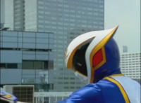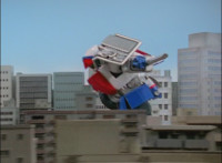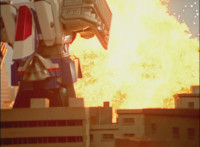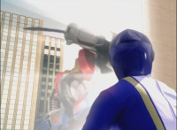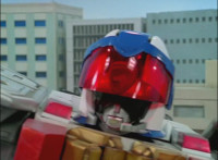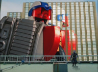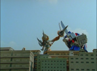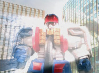 Omega rides the Uniforce Cycle on the wrong side of the street toward the flaming city where Angel Robot fights Omegamax Megazord. Angel Robot and Omegamax Megazord slash weapons sparkily, then break off, as we zoom in to see a Bluehead piloting the Robot. Zoom in on Red nod-talking in his cockpit. |