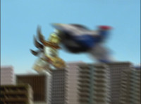 Omegamax Megazord in Semi-Cycle mode launches off the ground. |