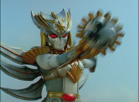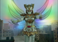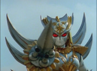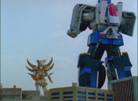 Angel Robot faces the Omegamax Megazord, then pulls out a spear and charges forth. |