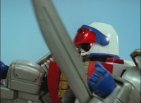 Angel Robot readies its spear, as Red recovers in the tilted cockpit, moving the Omegamax Megazord into blocking the spear with its armblade, then hopping up and downslashing into the Robot sparkily. |