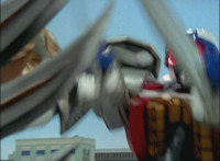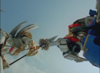 Omegamax Megazord readies armblades then charges forth, Angel Robot blocks them with its spear, then breaks off. |