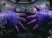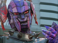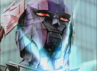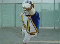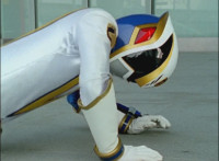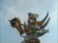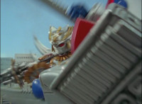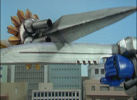 Omegamax Megazord crosses its blades, lowers its visor, then lowers arms and revs up its chest wheel, puts its legs together, spreads its bladed arms, then rolls forth on its stomach. |