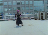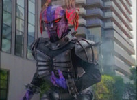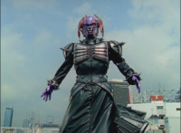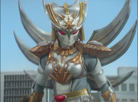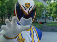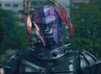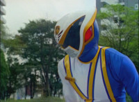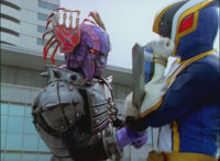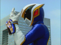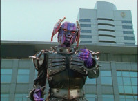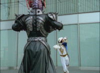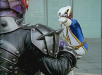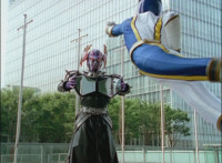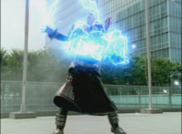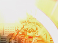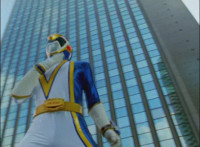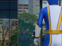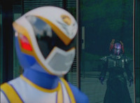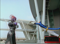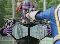 Mirloc materializes from within the mirror, and drops down onto a nearby roof, where he turns to the Omegamax Megazord and opens his chest plates, firing energy beams from his mirrors at the glass beside the Megazord, which refracts back at the chest plates with an image of the Megazord, Red reacting a bit, until he's overwhelmed by the energy flashing. |