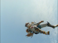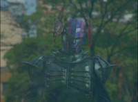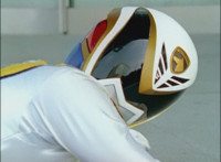Close-ups of his flashing helmet, before Omega does his special pose in front of a daybreak horizon. |