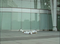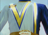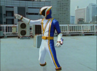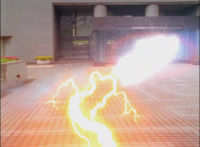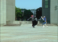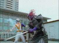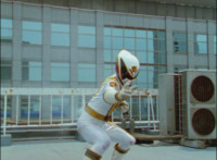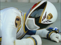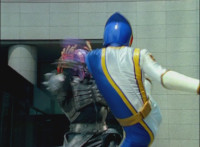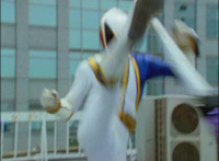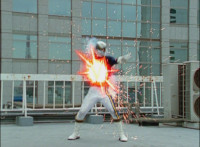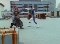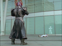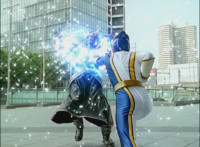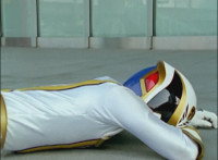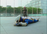 Omega falls even flatter on the pavement. Mirloc steps up and talks at the downed Ranger, then opens his chest plate, beginning to expose his mirrors, when Omega looks back, and suddenly gets up, lunging at him with his fist punching forth. It's repeated from several angles, before Omega lands an energized blow into Mirloc's chest mirrors, shattering the glass. Mirloc crackles, sparkles, and staggers back, as Omega straightens up and watches him writhe about. |