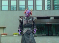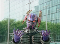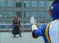 Omega is blasted, spark bursting, before getting tossed over the side of the building, landing on the ground below, as Mirloc follows gently, talking forth. Omega recovers, grips his Omega Morpher's handlebar, and twists it. |