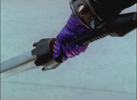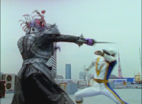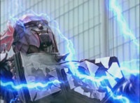 Cuts follow-ups of Megazord sparkily stabbing Robot. |
