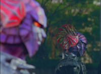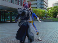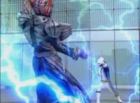 Mirloc talks and clenches his fist before rushing forth, Omega follows suit, the pair meeting in the middle of a plaza, blocking each other's blows each time, until Omega prepare to roundhouse. |