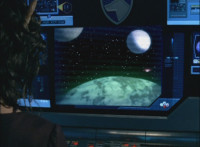 The green, bi-mooned planet of Varinox 12 has a spaceship approach. |