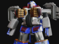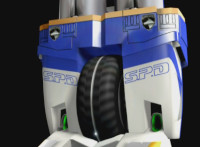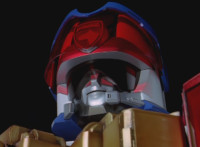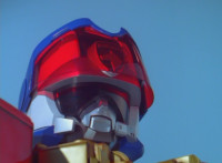 Omegamax Megazord lowers its visor, puts its legs together, then rolls forth on its stomach. |
