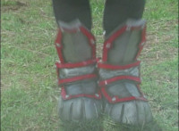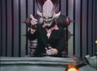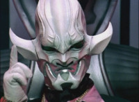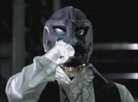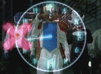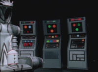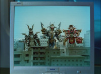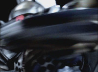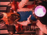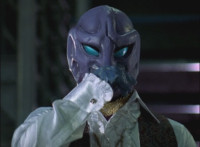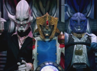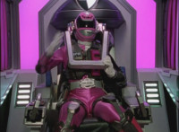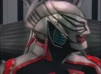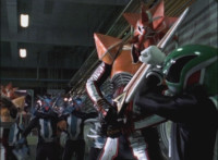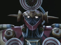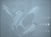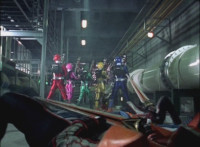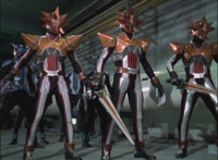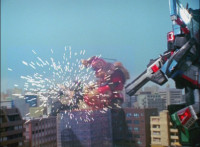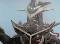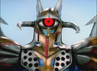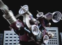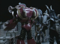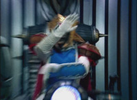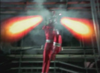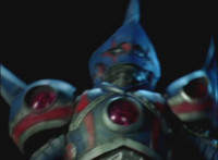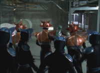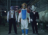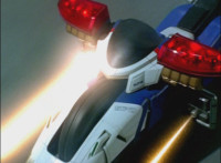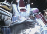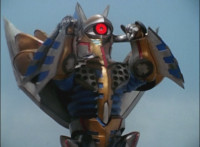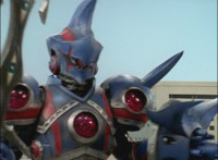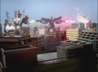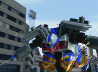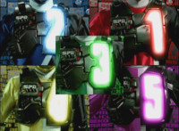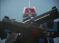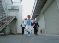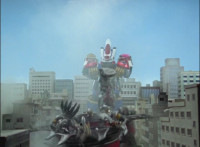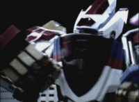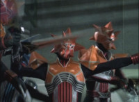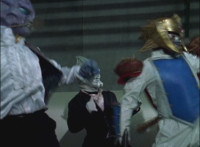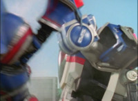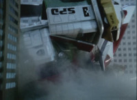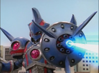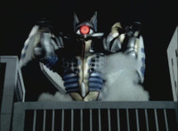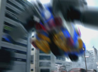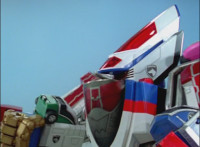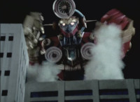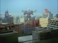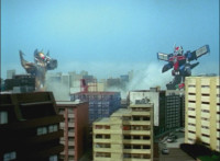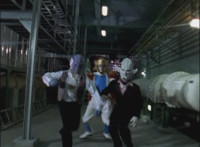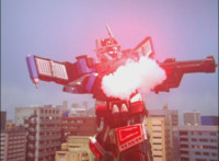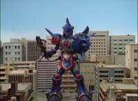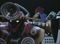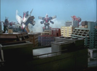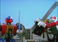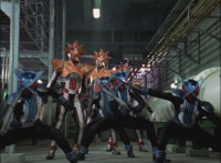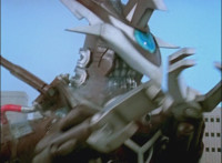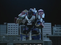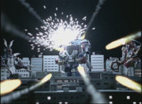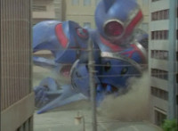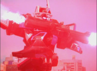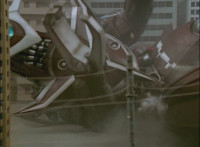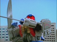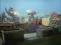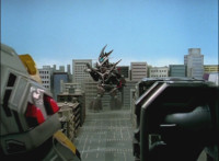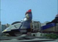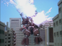 The SWAT Mode Rangers race through the Orangeheads & Blueheads, firing away as they past, bursting them all down. They then pause, the footsoldiers then collapse and explode massively behind the five. The alien trio race out into an alleyway, Chiaggo (or is it Delapoo?) landing in the cockpit of the Horned Robot, Delapoo (or is it Chiaggo?) landing in the cockpit of the Dish Robot, and Gineka landing in the cockpit of the Cyclops Robot. |