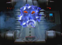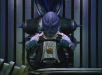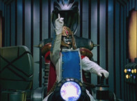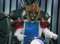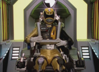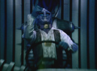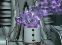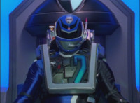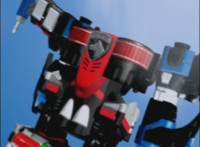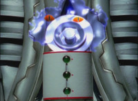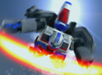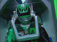 Delta Squad Megazord finishes coming to a stop on the Omegamax Cycle. Amoeba's Robot lands and turns to face it, prompting the Megazord to aim its Blaster at the Robot and open fire, bursting it and its cockpit until Amoeba pops out of his jar and hovers in the seat. |