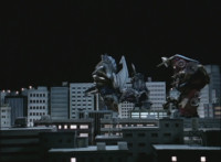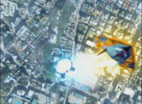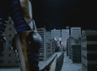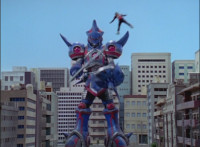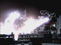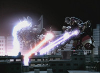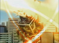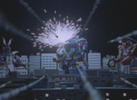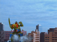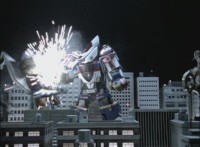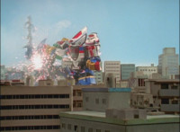 A trio of Robots walks into the city, then starts eyebeam blasting the ground sparkily. Deltamax Megazord appears, goes over and grabs the Dish Robot, which breaks off and sparkily strikes it back. The Cyclops Robot also sparkily bashes the Megazord as the other two hold its arms. Deltamax breaks free and sparkily bashes the Horned Robot, before sparkily bashing the Cyclops Robot. |