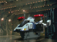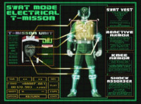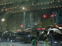 The SWAT Mode Rangers touch their mics and nod, then race around a corner into Section E-1, where they enter the Zord hangar for their new SWAT Flyers. Each Ranger boards their own cockpit and locks into the guards. |