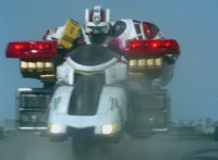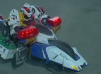 Delta Squad Megazord races alongside the Omegamax Cycle, then looks over at it. Delta Squad Megazord mounts the Omegamax Cycle and rides it. |