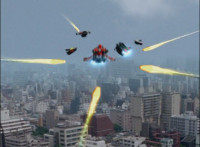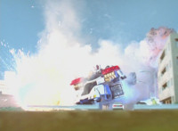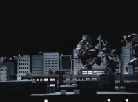 Shot 2 is given comic panel borders between each cockpit; cuts follow-ups of Robots targeting and blowing up a spot in the city. |