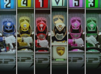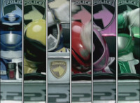 The six Rangers in their cockpits give a simultaneous thumbs down. |