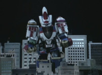 The five Rangers cross arms over their chests in unison before a zoom in on Red, as their SWAT Flyers come together to form the SWAT Megazord, which touches down in the city upon completion. It stands between all three Robots, posing with its twin pair of Blasters. Delapoo talks in his cockpit. |
