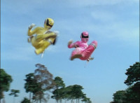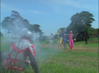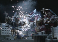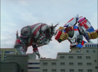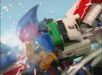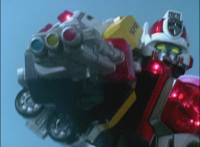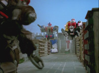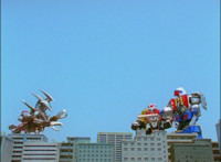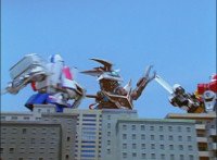Cuts follow-ups of the Cycle-riding Megazord firing on the Robot, who returns fire, before the Megazords combine to form Deltamax. |