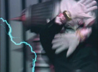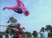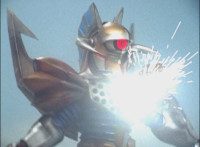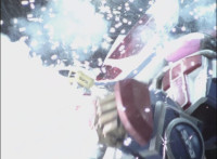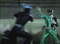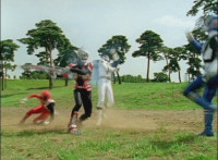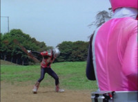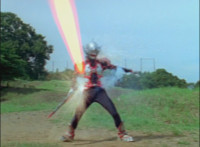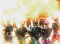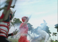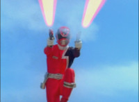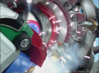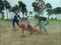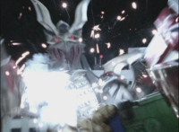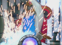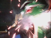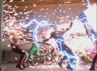 Blue & Green leap up and slash their batons at Silverhead sparkily. Red leaps up and fires both Blasters at Silverhead, spark bursting him. |