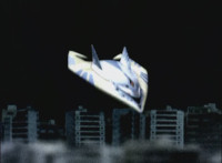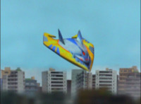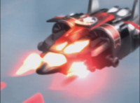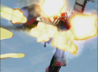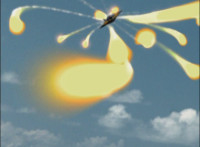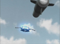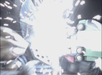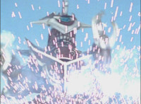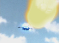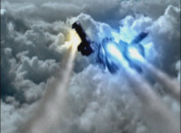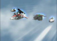 Each Ranger's cockpit tilts, as their SWAT Flyers turn straight upward at the last second and cause the laserbolts to collide explosively in midair. Gineka's Robot jerks arms in frustration, Gineka upset within, Green talks in his cockpit. |