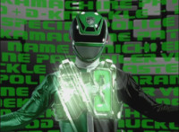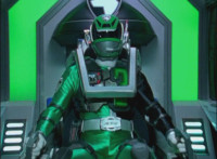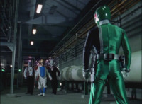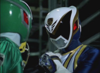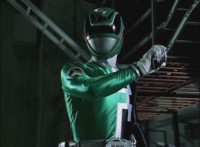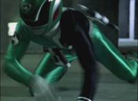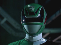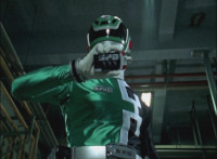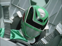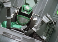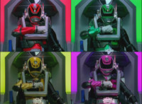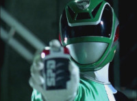 Green turns around and talks to Omega, touching his shoulder. He responds, then rushes off, as the Blueheads and Orangeheads recover. Green takes the lead of the team, in talking, then pulling out his Delta Morpher, activating SWAT Mode, and transforming into SWAT Mode. His teammates join him, as they then pose with their Delta Enforcers. Facing the Heads of Oranges & Blues, Green nod-talks, then leads the team in rushing forth. |
