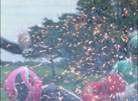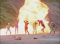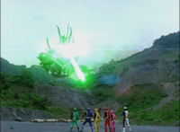 Amoeba's Robot stands up above the mountains, as the six Rangers rush up to gawk at it. The Robot fires eyebeams down at the six, bursting behind them. |
