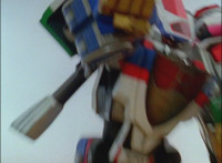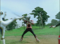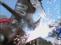 Cuts follow-up of Megazord sparkily bashing both Robots on the head with Blasters. |
